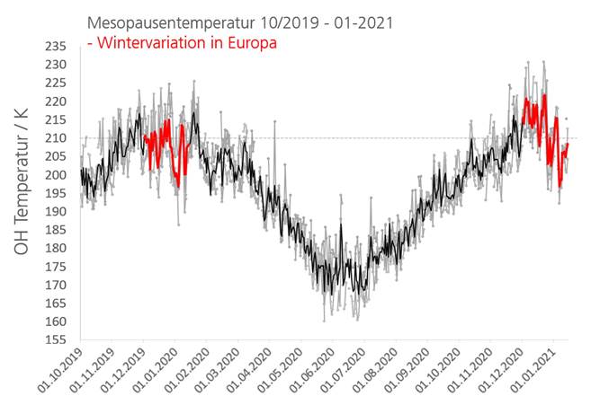 At the same time we are now observing a strong La-Niña event, a global weather phenomenon that last took place in 2015/2016. That normally means that the planetary waves are especially weak, so that the vortex remains poly-symmetric and undisturbed (see EOC News “Ozone hole 2020” of Dec. 10, 2020) while the mesopause region is characterized by above-average high temperatures. Until mid-December this could also be seen quite clearly in our data (see figure 3).
