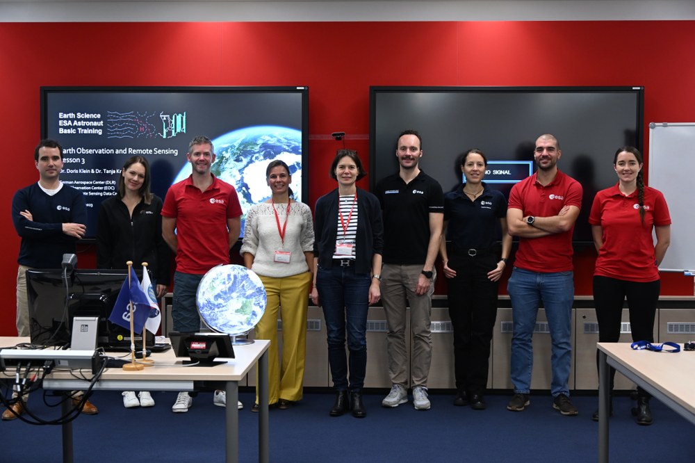On 13 and 14 November 2023, scientists from the DLR Earth Observation Center (EOC) supported the training of ESA astronauts at the European Astronaut Centre (EAC) in Cologne. Seven astronauts were instructed in Earth observation and remote sensing as part of their basic training.