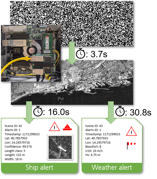 The user receives so-called „alerts“ containing only the necessary information and not the full EO product. From the acquired L0 raw data to the alerts in the hand of the end user via satellite-to-satellite communication, ship detection on a 400 km² SAR scene takes less than one minute.