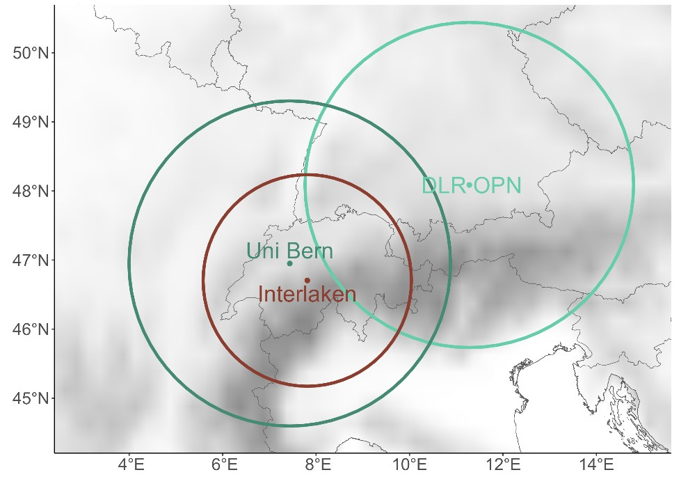 The University of Bern uses temperature radiometers (TEMPERA-C) and wind radiometers (WIRA-C), which provide information on the vertical temperature and wind gradients over Bern, as well as a meteor wind radar, which makes it possible to detect the wind in the 80-100km altitude range. DLR uses an airglow camera (FAIM - Fast Airglow IMager) with a scanning mechanism, which allows it to "scan" the sky over from horizon to horizon in order to achieve a large spatial coverage with high spatial resolution at the same time. This allows horizontal gravity wave parameters, which can be seen in the OH-airglow, to be determined in the corresponding altitude layer around 86km. The field-of-view in spans a diameter of 500km by a spatial resolution of approx. 200-300m per pixel. This "Scan-FAIM" developed by EOC will be set up near Bern as part of the project. Together with another similar instrument at the DLR in Oberpfaffenhofen, it will cover a large part of the Alpine region at the height of the OH airglow layer at an altitude of 86 kilometres (see the map).