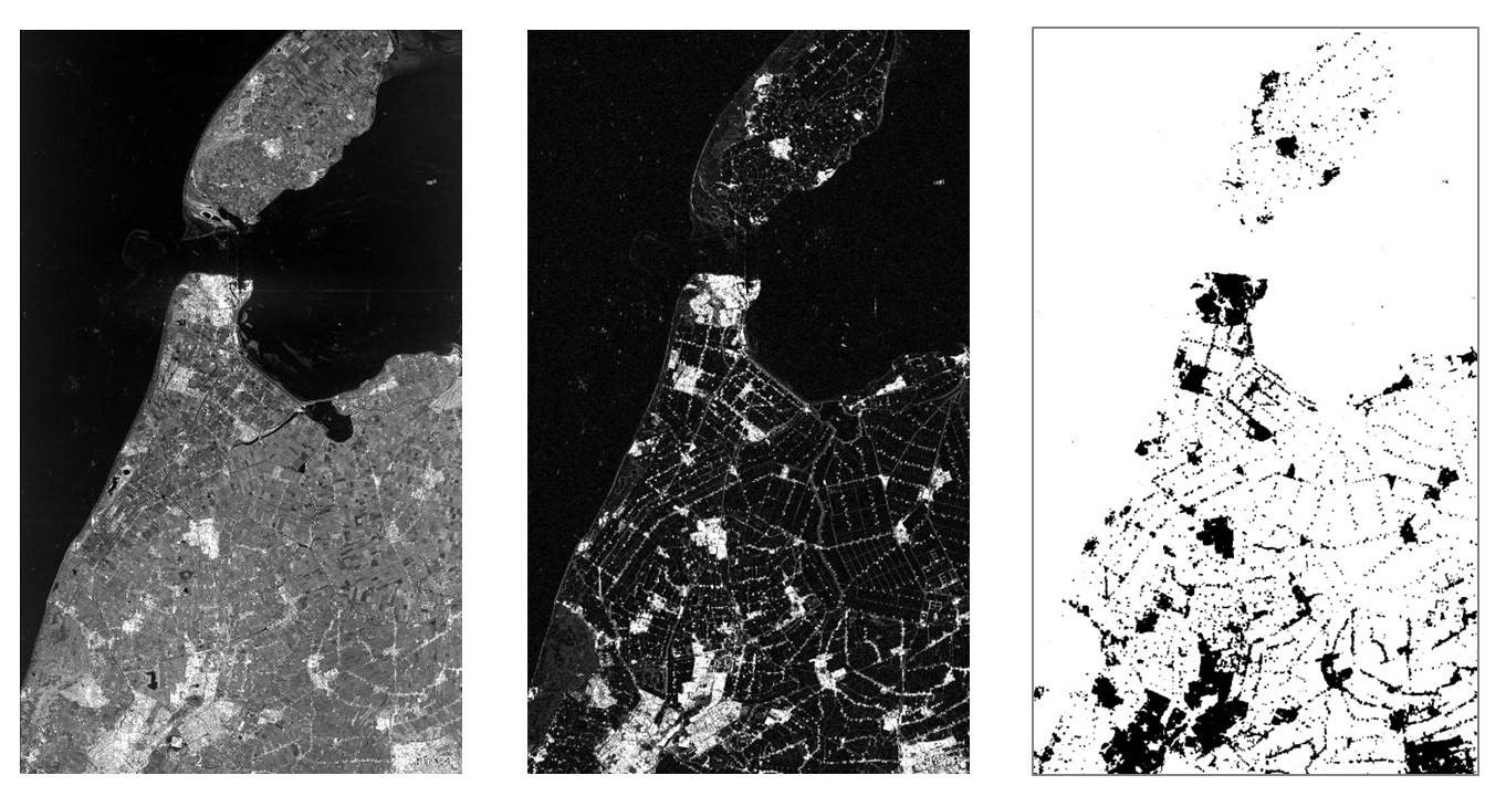 Backscattering image (amplitude), speckle divergence image and Urban Footprint of Den Helder, Netherlands