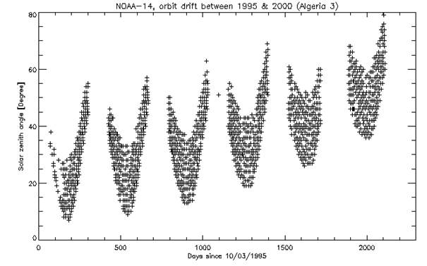 Some of the NOAA satellites are subject to a considerable orbit drift – therefore, the time of the overflights changes with the aging of the satellite. Consequently, the solar zenith angles at acquisition differ, which has a strong impact on the measured reflectances.