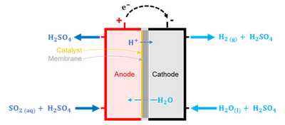 SO2-depolarised electrolysis is based on polymer electrolyte membrane (PEM) electrolysis technology for water splitting. It is a promising electrolysis process for producing hydrogen and sulphuric acid from an SO2/H2O mixture. This process is particularly thermodynamically efficient and enables the production of sulphuric acid, which is used directly in a process for treating zinc-containing waste as part of the circular economy. The hydrogen can then be used to replace fossil fuels in sulphuric acid recycling.