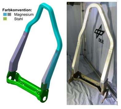 Impressions of the development process (left: CAD representation of the welded primary concept of the Mg backrest structure; right: Prototype of the bonded secondary concept)