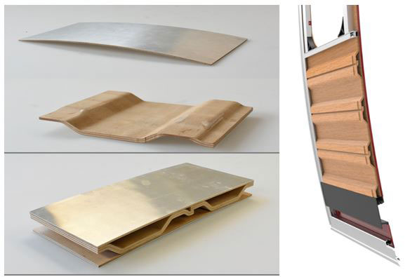 For the rail vehicle door assembly, a modular wood-intensive approach was implemented based on the existing construction method. Individual hat profiles that can be used for both flat and slightly curved structures form the core of the structure. These elements are combined with very thin aluminium sheets (0.6 mm) reinforced with wood veneers. The concept developed made it possible to use significantly simpler and narrower aluminium profiles. The wooden components can be manufactured inexpensively and with simple tools. In addition, the thickness of the door panel could be reduced from 38 mm to 32.6 mm. Overall, a weight reduction of 15% and a substitution of aluminium components by wood could be achieved. In an initial step, the concept was simulated for various load cases such as "misuse" and wind loads at DLR and then built as a prototype at the company Schaltbau Bode and successfully tested on a component test bench.