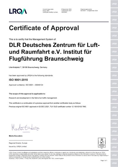 Since 2003, the Institute of Flight Guidance has been certified according to the quality management standard DIN EN ISO 9001.