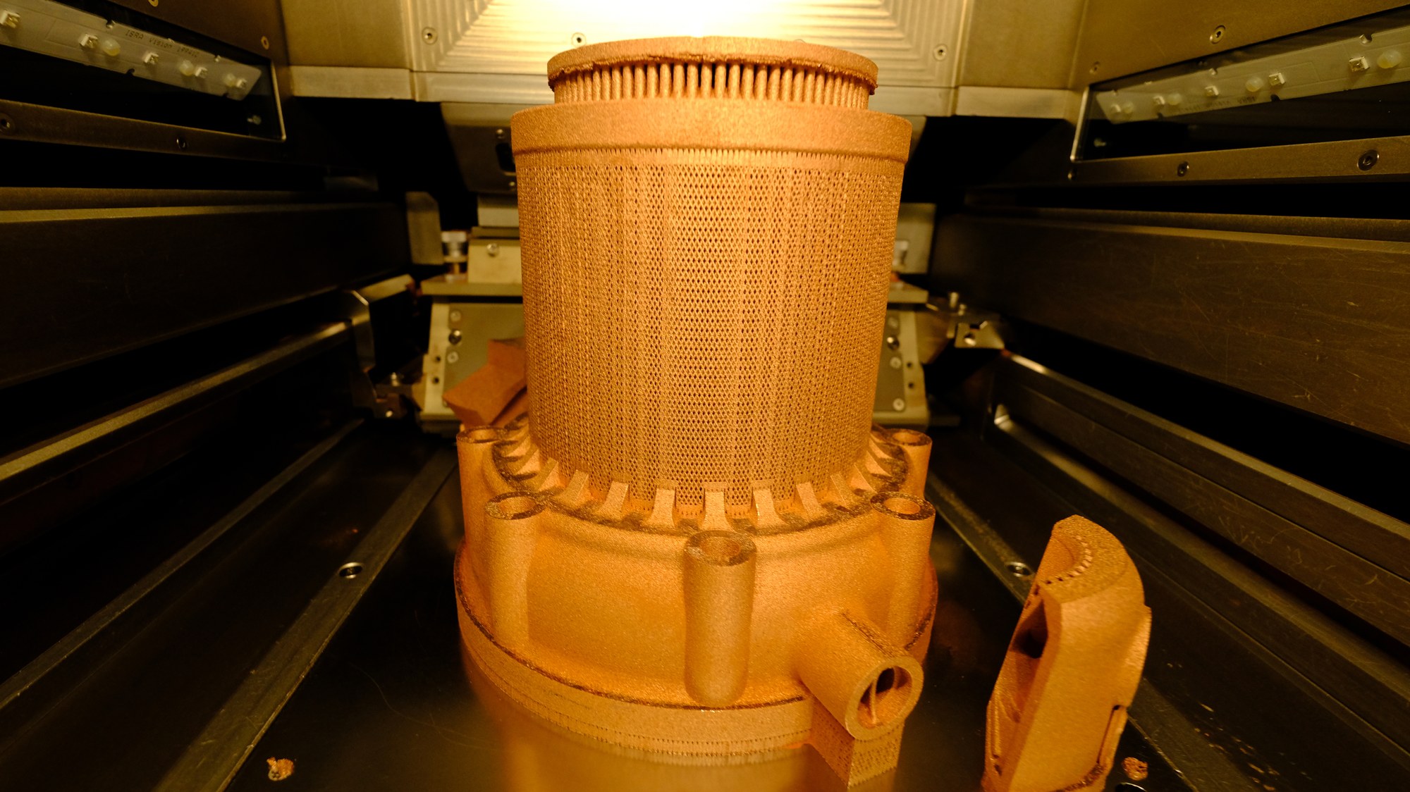 Using laser powder bed fusion (PBF-LB/M or LPBF) we manufacture new designs for aeronautic and space applications like the copper liner for space propulsion shown here. To this end, we develop processing strategies and manufacturing chains, apply process monitoring tools and analyze the fabricated materials and components with a variety of characterization techniques.