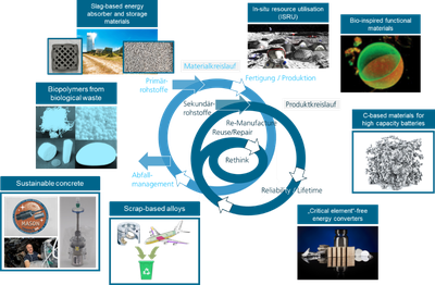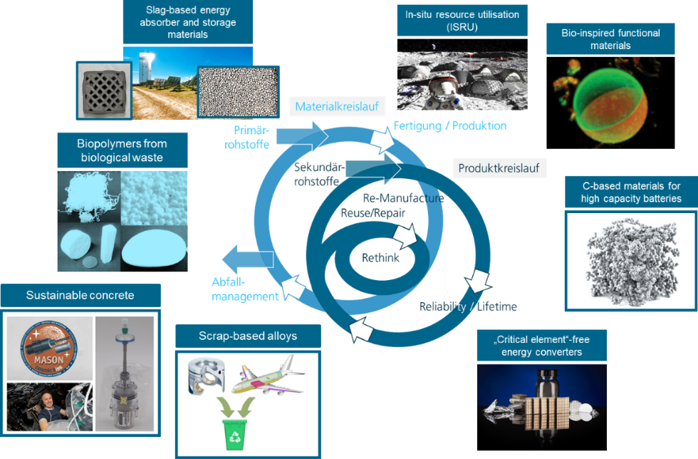 In light of these challenges, it is essential that the development of materials and material-intensive technologies maximizes economic, social, and environmental sustainability. Our institute fully embraces this responsibility and directs a significant share of its research toward advancing sustainability—both on Earth and in space—with a strong focus on contributing to a circular economy. The following figure illustrates the breadth of our expertise in this field.