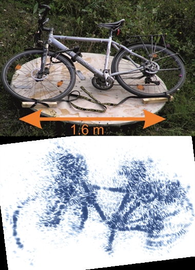 Figure 1 shows the RCS distribution of a lying bicycle at very high spatial resolution. Hence very much detail like the wheels, the structure of the frame, and the drive system can be recognized. Note that very much parts of the bicycle are in the size order of the wavelength (˜3 cm) or even much smaller.