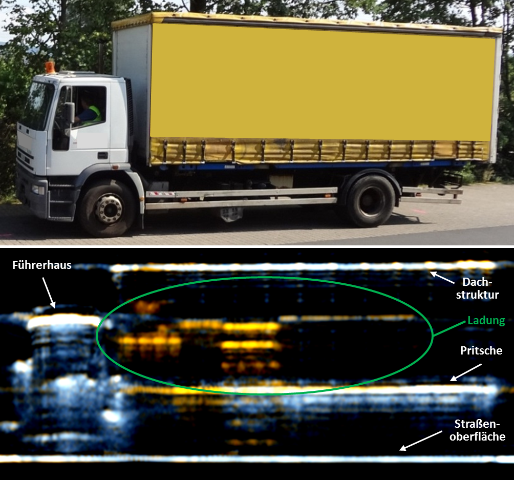 Photograph (top) and vertical cut through a three-dimensional X-band ISAR image (bottom) of a truck carrying various loading of different size and height. Data was taken using the UNIRAD system. Spatial resolution is around 8 cm.