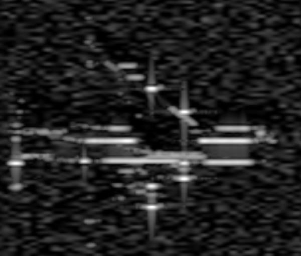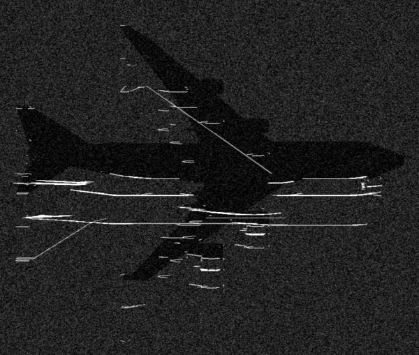 Such a reflectivity map can be assumed to be an ideal SAR image, because it lacks effects like finite bandwidth or side lobe effects. Additional to the prominent scatterers, also the clutter return and the shadow of the airplane are included into this reflectivity map.