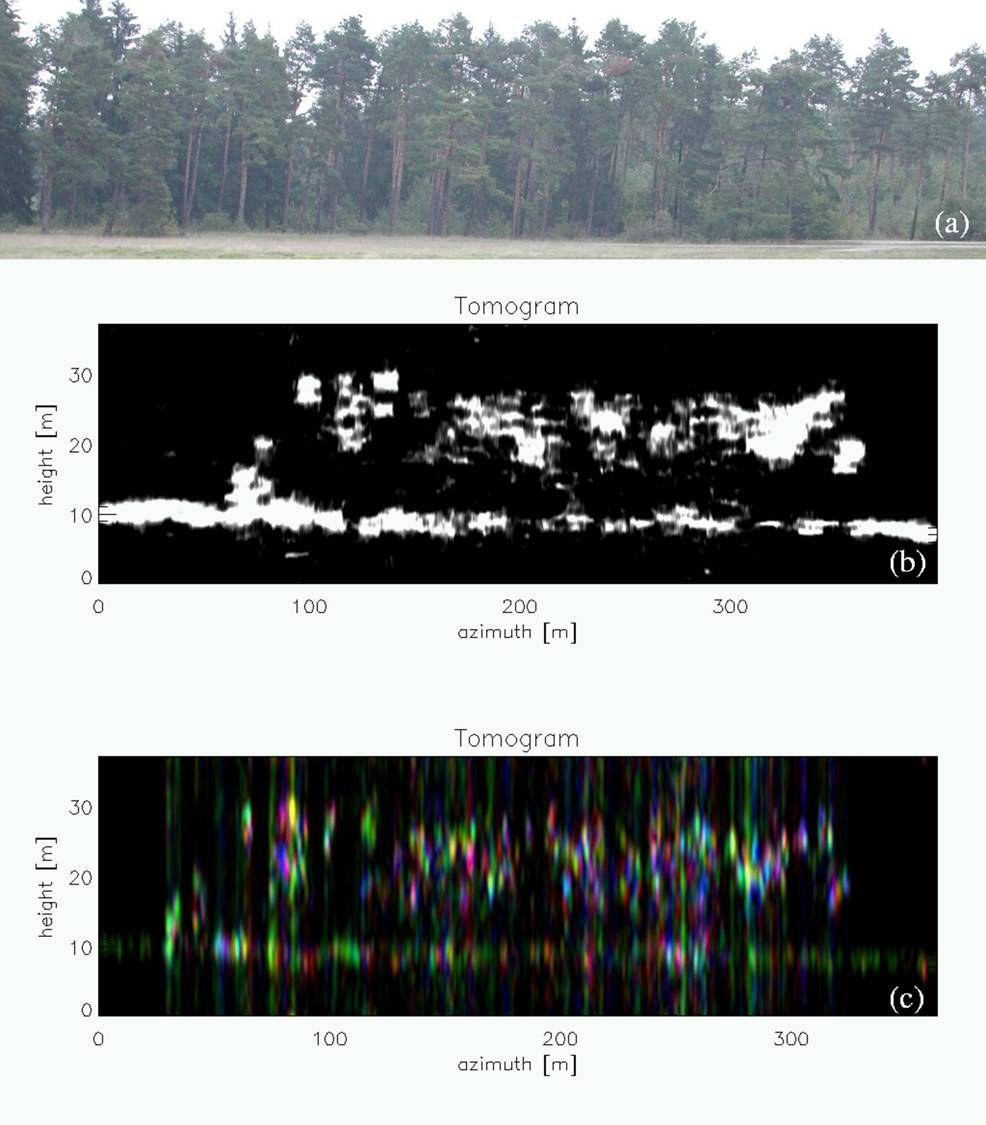 (a) Picture of the imaged forested area. (b) Tomographic representation of the vegetation obtained by means of the Capon method and (c) by means of the coherent Time domain beamforming in the Pauli basis (colour coding: Blue= Pauli1, Red=Pauli2, Green=Pauli3).
