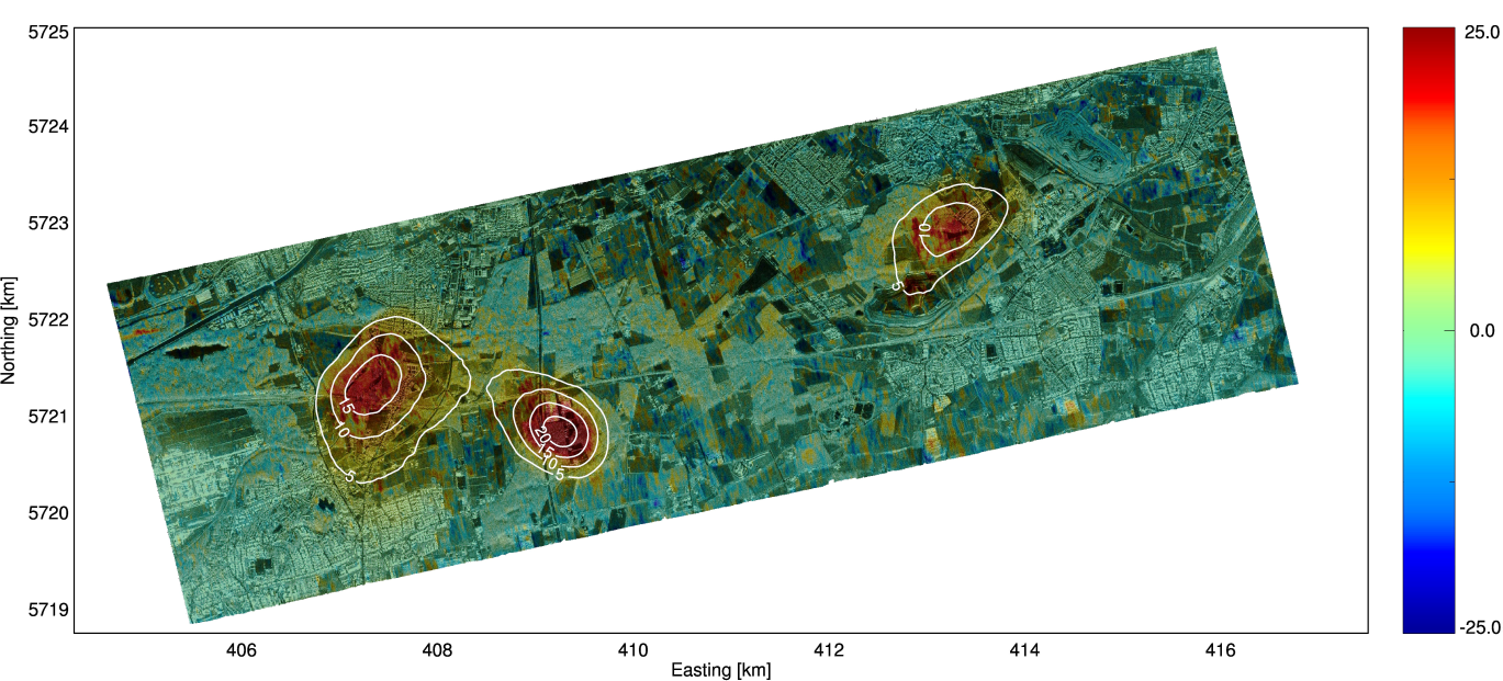 Local subsidence of up to 25 cm within 6 months, caused by mining. Measurement with airborne differential interferometry in L-band.
