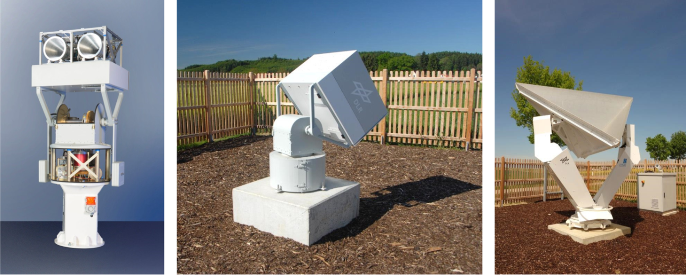 Calibration devices of the DLR SAR calibration center: remote-controlled transponder in the laboratory (left) and deployed in the calibration field (center), and remote-controlled corner reflector (right) at one of the permanent sites within our calibration field covering a total area of 120 km x 40 km.