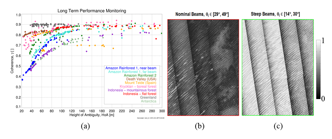 (a) and coherence improvement over sandy areas by optimizing the acquisition geometry for improving the SNR: nominal acquisitions (b), optimized acquisitions using steeper incidence angles (c).