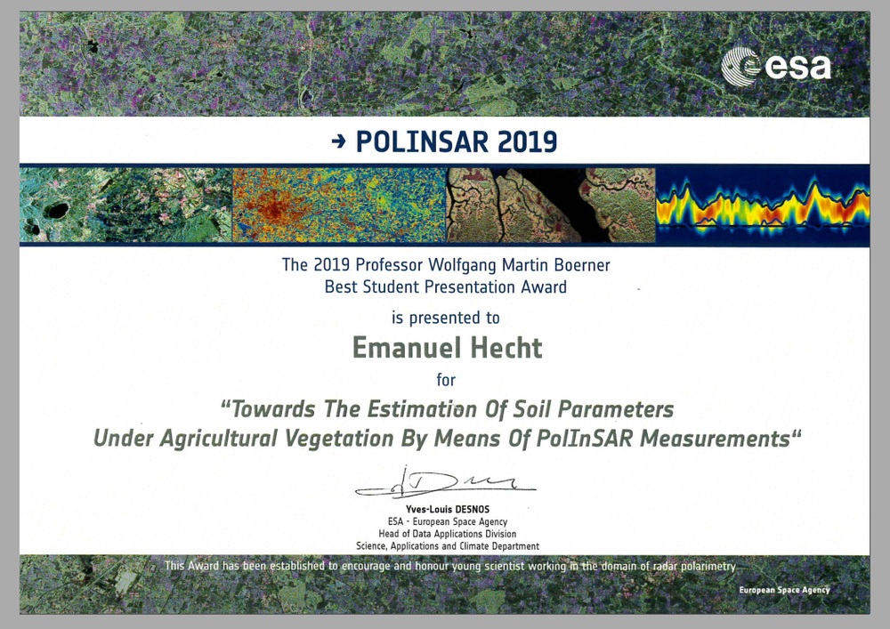 We are happy to announce that our colleague Emanuel Hecht, Microwaves and Radar Institute, received the Prof. Boerner Student Award at ESA's PolinSAR Workshop in Frascati (Rome) on 01 February 2019 for his paper entitled "Towards The Estimation Of Soil Parameters Under Agricultural Vegetation By Means Of PolInSAR Measurements". His coauthors are Alberto Alonso-Gonzalez, Kostas Papathanassiou and Irena Hajnsek. Contratulations from all colleagues, Emanuel!