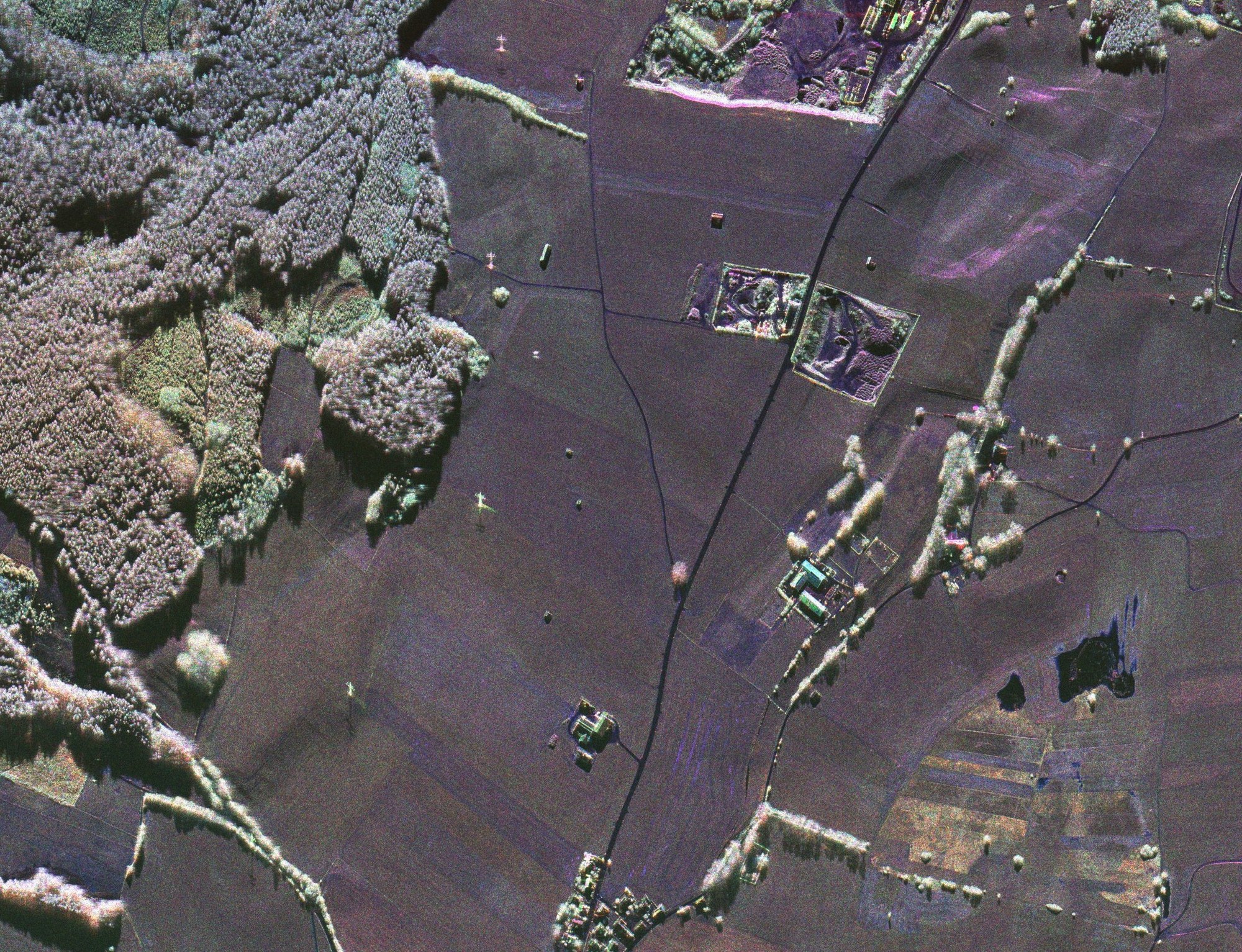 Farms and grassland in the south of E-SAR/F-SAR calibration site at the airfield Kaufbeuren, Germany. C-band is, after X-band and S-band, the third fully polarimetric sub-system of F-SAR and this image is the historically first full polarimetric C-band image ever of F-SAR.