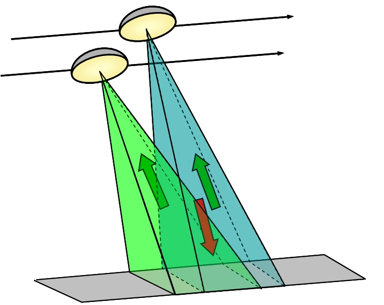 The mission concept is based on two imaging modes, as shown in Figure 32. In the Deformation Mode a strip up to 350 km wide is imaged with a fixed transmit polarisation. In the 3-D Structure Mode the two satellites are operated in a formation whereby they are displaced with respect to the look angle, in order to create an interferometric baseline suitable for the vertical structure measurements. Fully polarimetric operation limits the swath width to approx. 180 km in the high-resolution mode, due to limitations of the internal data rate. Due to this, for complete coverage of 3-D structure measurements at the equator, a minimum revisit time of 16 days is obtained; at higher latitudes the time between images is correspondingly reduced.