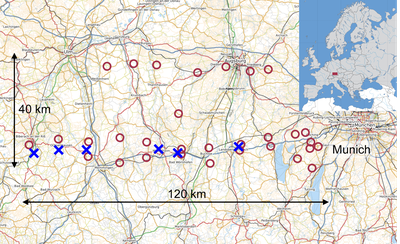 The DLR calibration site consists of 37 target positions with 20 permanently installed corner reflectors. The six newly installed remote-controlled targets are shown in blue (Map: (c) OpenStreetMap).