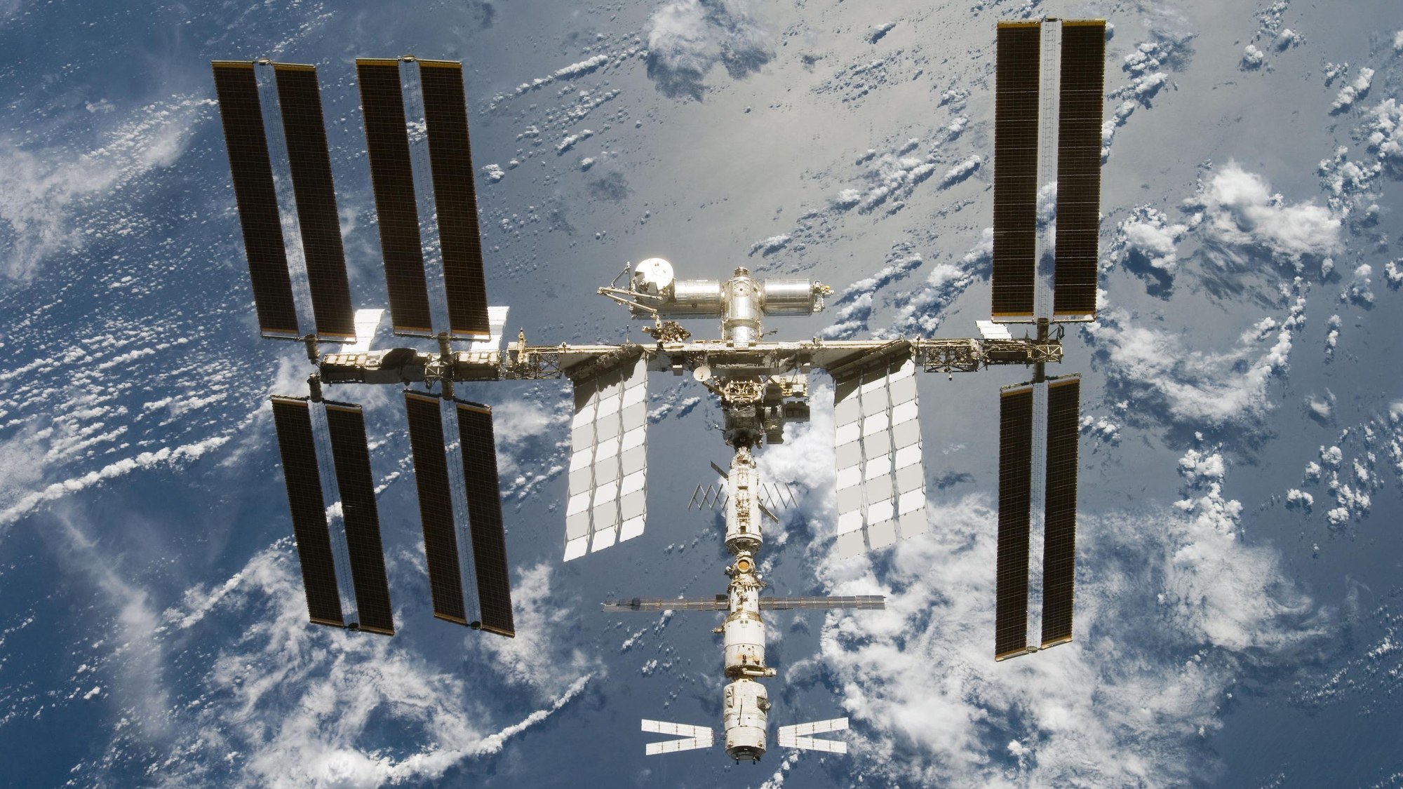 The ISS above the cloud-covered ocean. At the bottom of the image is ATV Jules Verne. In this image, Jules Verne was in a low-power state, the so-called sleep mode.