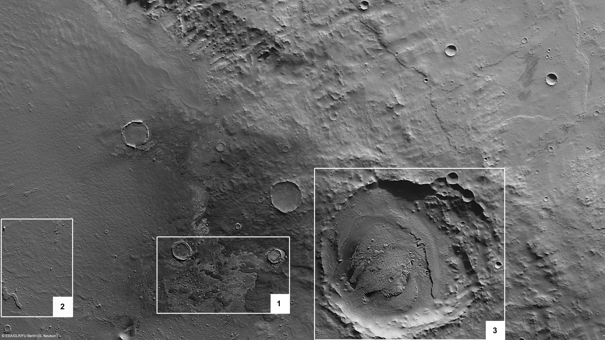 The interior of the Schiaparelli impact basin has been modified by multiple geological processes including the fall of ejecta blasted upwards by the initial impact, the flow of lava to create the smooth plains and deposition of watery sediments. Box 1 shows part of these sedimentary deposits. The sediments forming the smooth plains in Box 2 have been modified by erosion, either by wind or water, or both to form sharp contours such as the narrow plateau at bottom left. The prominent crater in Box 3 is 42 kilometres across and is embedded in the inner crater rim of Schiaparelli. The interior of the crater is filled with sediments, which appear to form a terrace in the northern part and a delta-like structure near the centre. The image is centred on the equator of Mars, at a longitude of about 14°E, and was acquired on 15 July 2010 by the DLR-operated High-Resolution Stereo Camera (HRSC) on ESA's Mars Express spacecraft. The spacecraft was completing orbit 8363 of Mars.