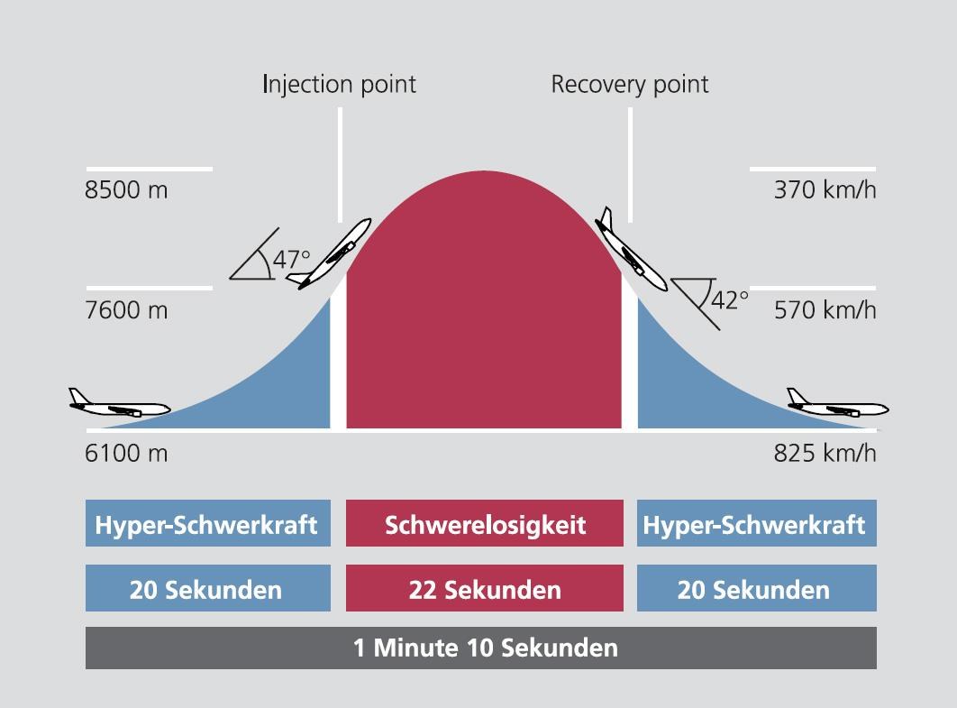 During a parabolic aircraft flight, test pilots fly the aircraft along a flight path that resembles an ideal ballistic curve. From horizontal flight, the aircraft first gains momentum at full thrust and then pulls up steeply. At this point, the people and devices on board the aircraft experience a force of 1.8 times the Earth's standard gravitational acceleration, pulling them towards the floor of the aircraft.