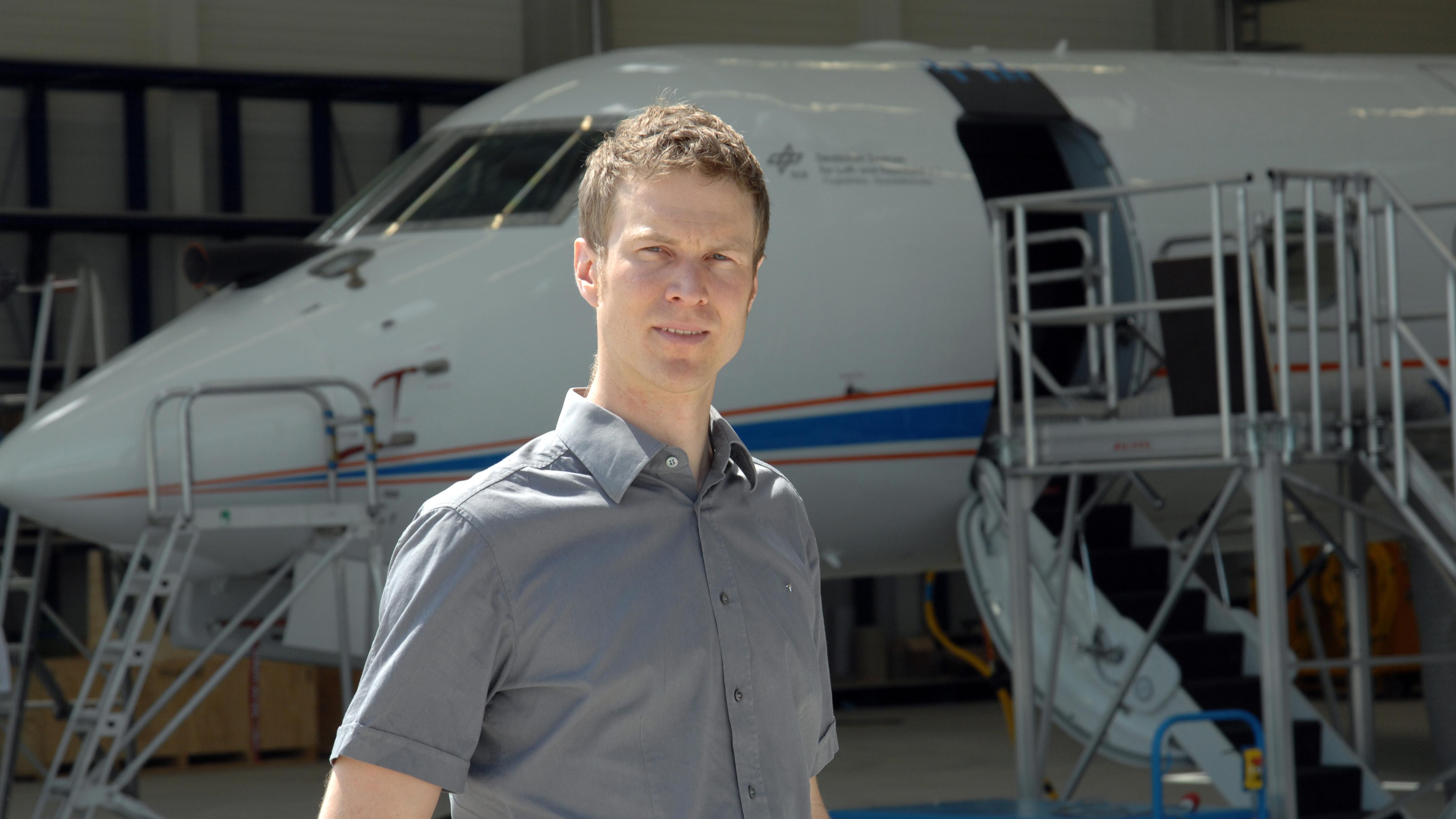 Frank Schreckenbach standing in front of the DLR HALO (High Altitude and Long Range) research aircraft.