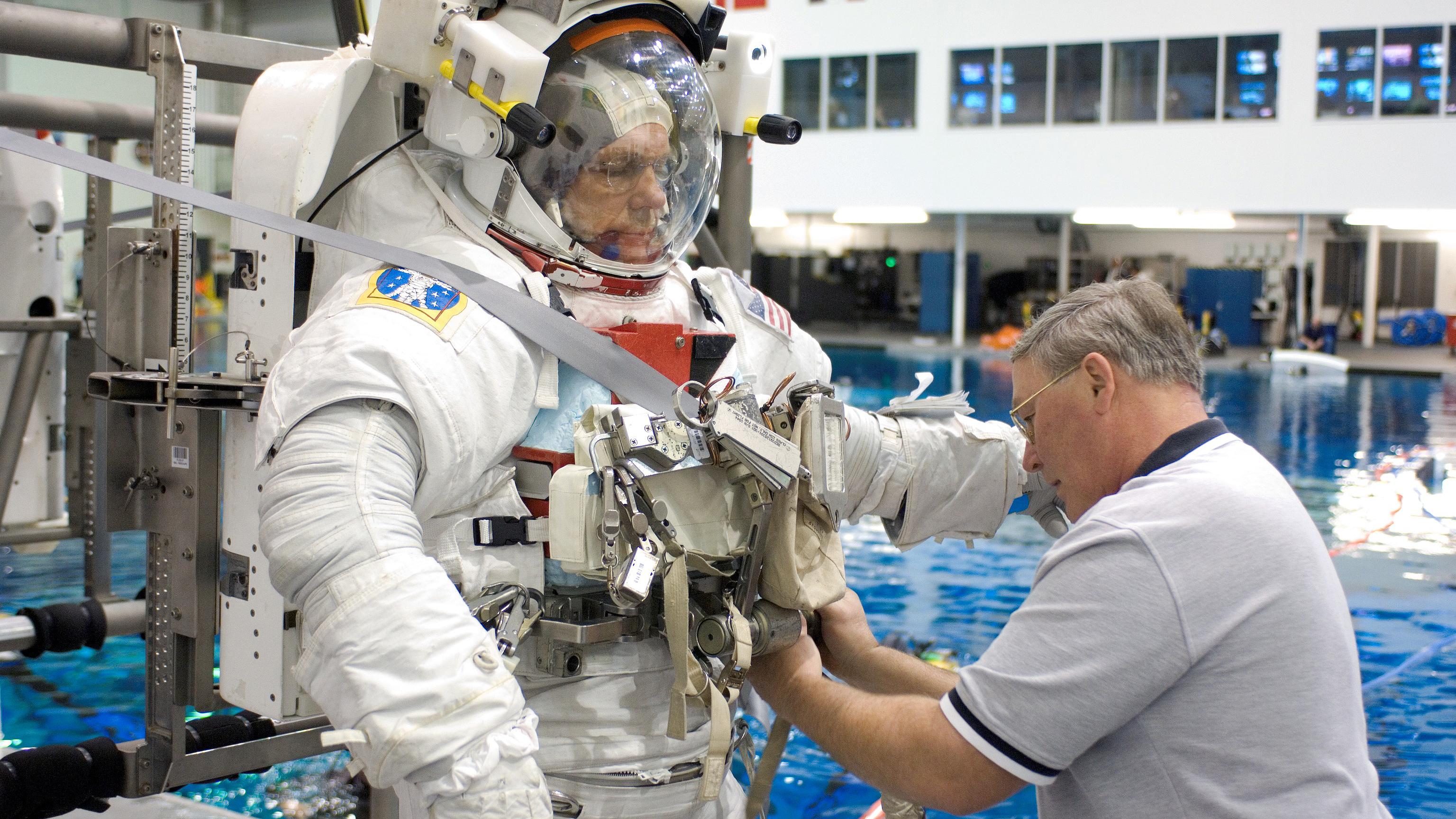 European Space Agency (ESA) astronaut Hans Schlegel, STS-122 mission specialist, dons a training version of the Extravehicular Mobility Unit (EMU) spacesuit prior to being submerged in the waters of the Neutral Buoyancy Laboratory (NBL) near Johnson Space Center. Jerry L. Ross, Chief, Vehicle Integration Test Office, assisted Schlegel.