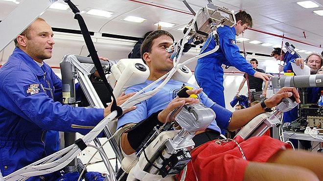 For the Exercise Kinetics Experiment, scientists examined the subject's breathing during a parabolic flight. The aim of the EKE is to be able to determine the physical capacity of the subject by monitoring the variation of oxygen intake and cardiovascular parameters.