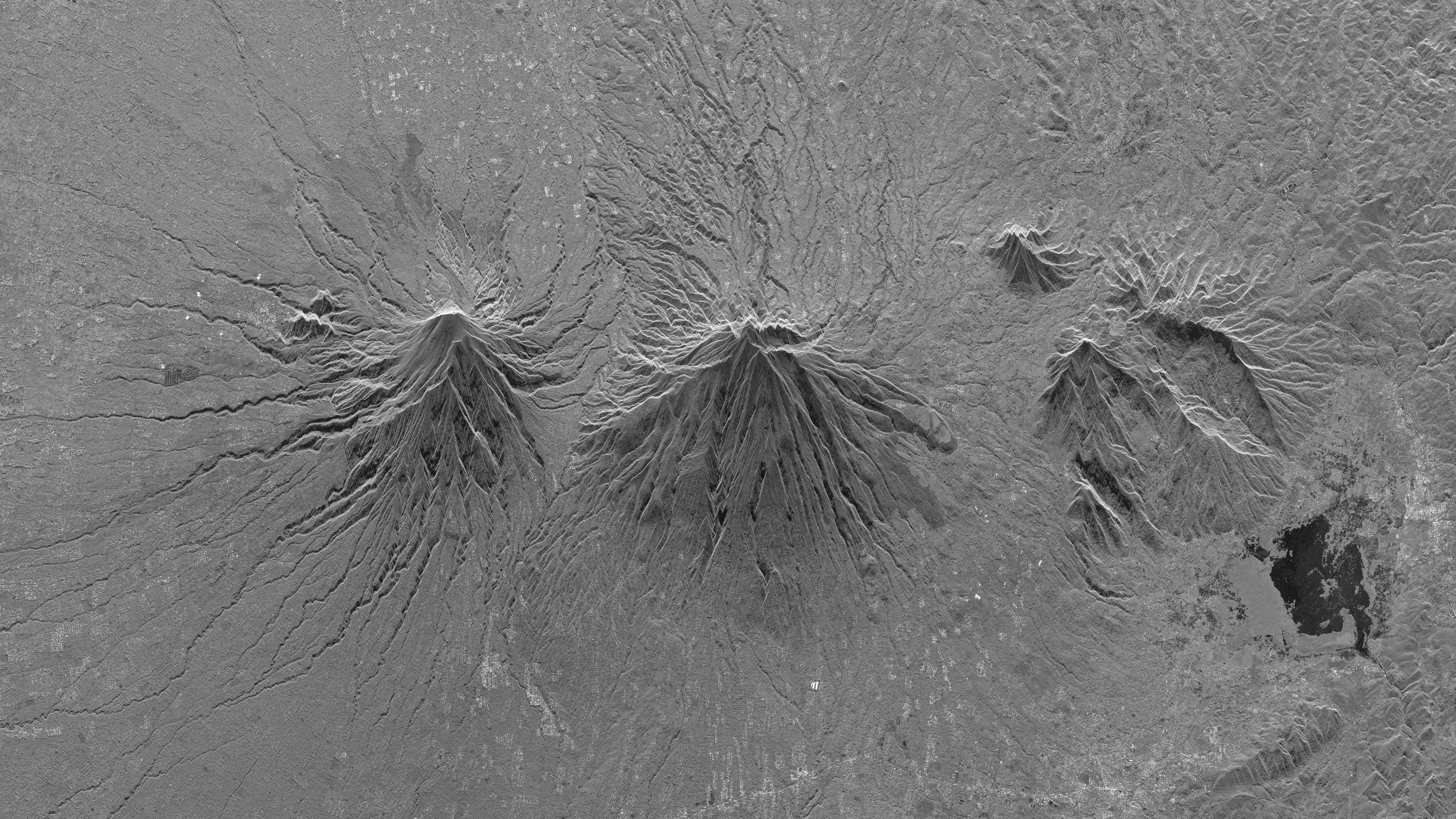 Mount Merapi on the island of Java (Indonesia) is known as one of the world's most dangerous volcanoes. The active volcano is situated north of the large conurbation of Yogyakarta, in the middle of a densely populated area. On the left of the image is Mount Merapi which is about 2900 metres high, next to Mount Merbabu on the right, which is assumed to be a dormant volcano. TerraSAR-X will, in the future, be able to detect even small movements of Earth's surface, thus assisting volcano analysis using interferometry measurements.
