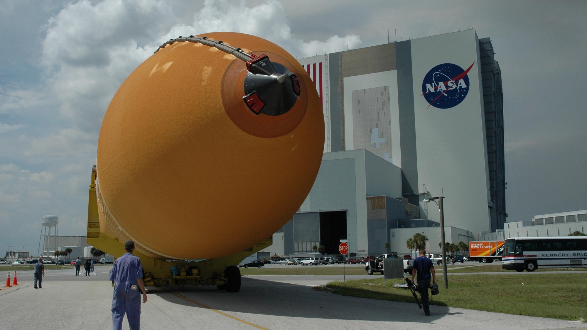 Kennedey Space Center, Florida: On its transporter, external tank No. 125 moves toward the Vehicle Assembly Building in the background. The tank arrived at the Launch Complex 39 Area turn basin on the Pegasus barge from the Michoud Assembly Facility near New Orleans. The external tank will be used on space shuttle Atlantis for mission STS-122 targeted for launch on 6 December 2007.