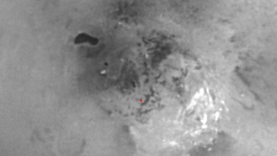 The true nature of this feature, seen here at left of centre, is not yet known with absolute certainty. However, the feature's darkness, the shore-like smoothness of its perimeter, and its presence in an area where frequent convective storm clouds have been observed by Cassini and Earth-based astronomers made it the best candidate for an open body of liquid on Titan when this image was taken in June 2005.
