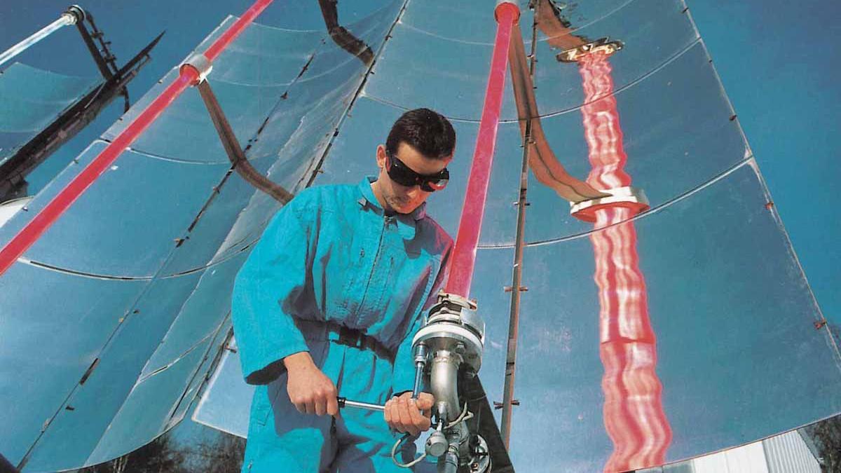 The image shows a parabolic trough for organic, photo-chemical syntheses in sunlight (PROPHIS) at the DLR site in Cologne.