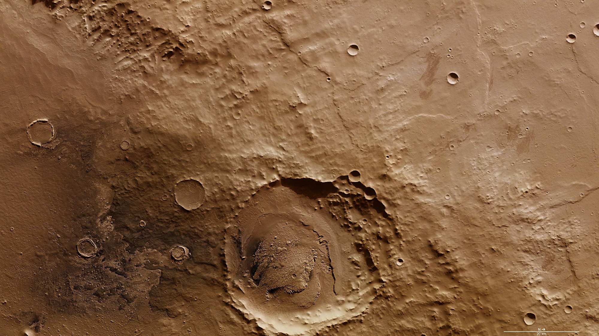 Schiaparelli is a large impact basin about 460 kilometres across, located in the eastern Terra Meridiani region on the planet's equator. The image shows just a small part of the crater's north-western rim cutting diagonally across the image (top left to bottom right) and a smaller 42-kilometre diameter crater embedded in its rim. The image is centred on the equator of Mars, at a longitude of about 14°E. The DLR-operated High-Resolution Stereo Camera (HRSC) on ESA's Mars Express spacecraft acquired the image on 15 July 2010. The spacecraft was completing orbit 8363 of Mars and the ground resolution of the image is about 19 metres per pixel.