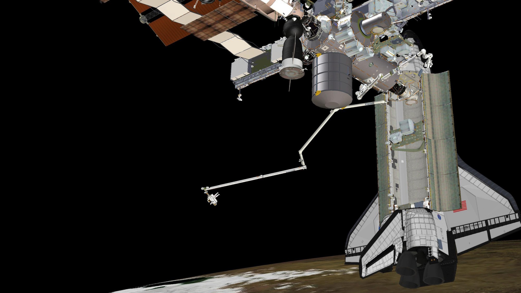 Computer-generated artist's rendering of the Space Shuttle Discovery docked to the International Space Station. This angle shows an intermediate position of the shuttle robotic system during a test of the 50-foot robotic arm boom extension, usually used for remote shuttle Thermal Protection System (TPS) inspections, as a potential work platform for hard-to-reach repair sites on the bottom of the orbiter for Detailed Test Objective (DTO) 849.