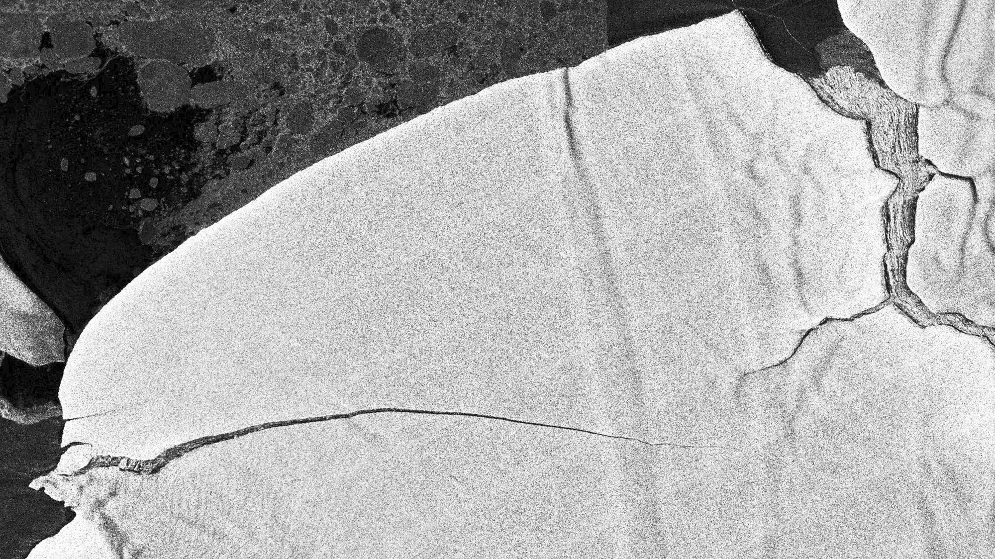 To better understand the calving of icebergs, glaciologists from the University of Hamburg Climate Campus have been monitoring the Fimbul Ice Shelf from an altitude of 500 kilometres using the German Aerospace Center (DLR) radar satellite TerraSAR-X. Until now, they have not been able to predict how much ice will break away each year or where. This image was obtained on 21 December 2009, when the fissures had not yet advanced far enough into the interior for calving to occur.
