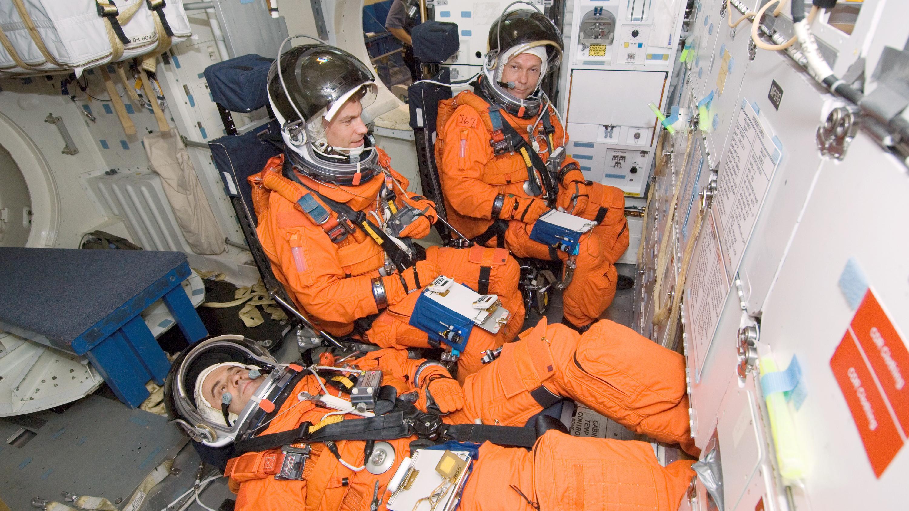 European Space Agency (ESA) astronaut Léopold Eyharts (foreground), Expedition 16 flight engineer; astronaut Stanley G. Love and ESA astronaut Hans Schlegel, both STS-122 mission specialists, participate in a training session in one of the full-scale trainers in the Space Vehicle Mockup Facility at Johnson Space Center. Attired in training versions of their shuttle launch and entry suits, the three are seated on the middeck for a post insertion/de-orbit training session. Eyharts is scheduled to join Expedition 16 as flight engineer after launching to the International Space Station on mission STS-122.