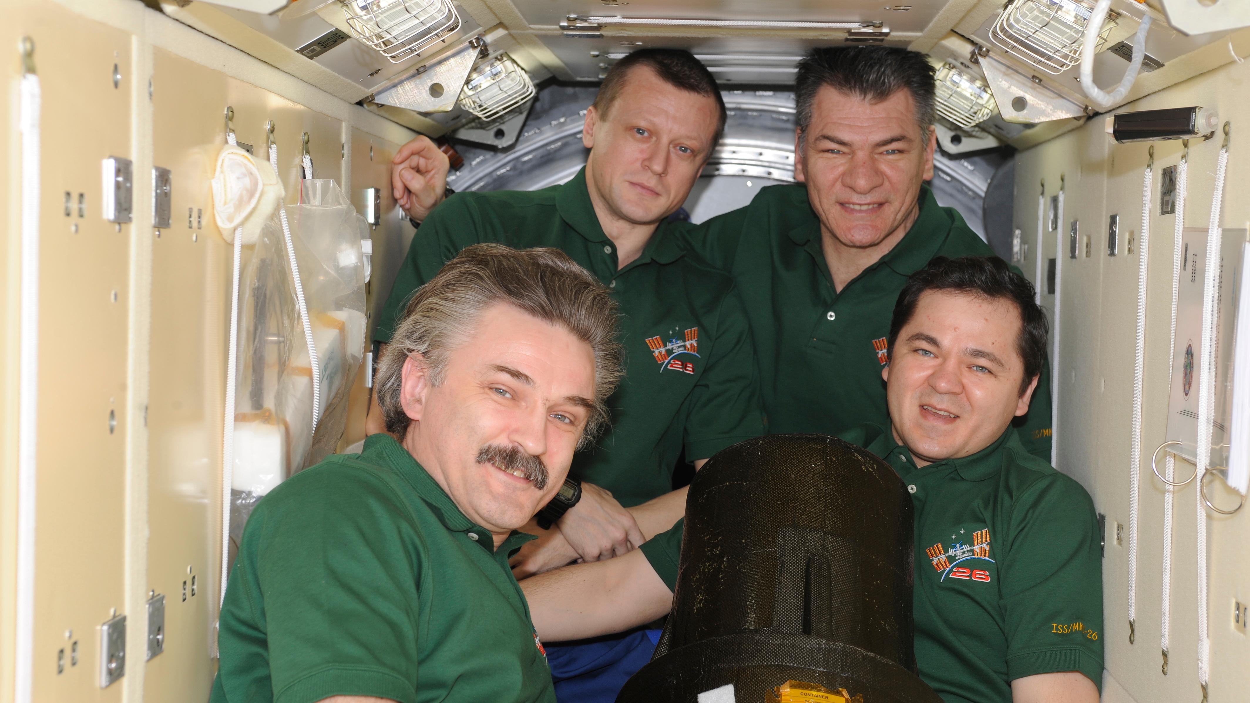 Alexander Kaleri, Dmitry Kondratyev, Paolo Nespoli and Oleg Skripochka store the Matroshka mannequin in the Russian Zarya module.
