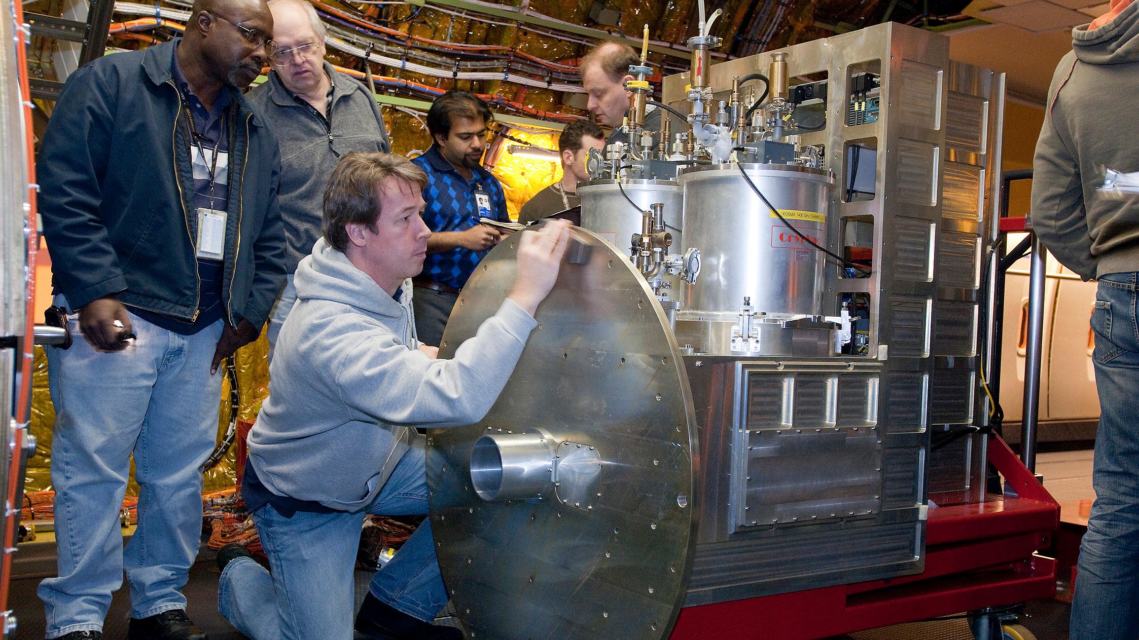 Final inspection and cleaning of the mounting plate before mating with the telescope. Rainer Strecker (DSI quality Management) works with the mounting plate: Alvin Mitchell and Rolf Güsten are in the background.