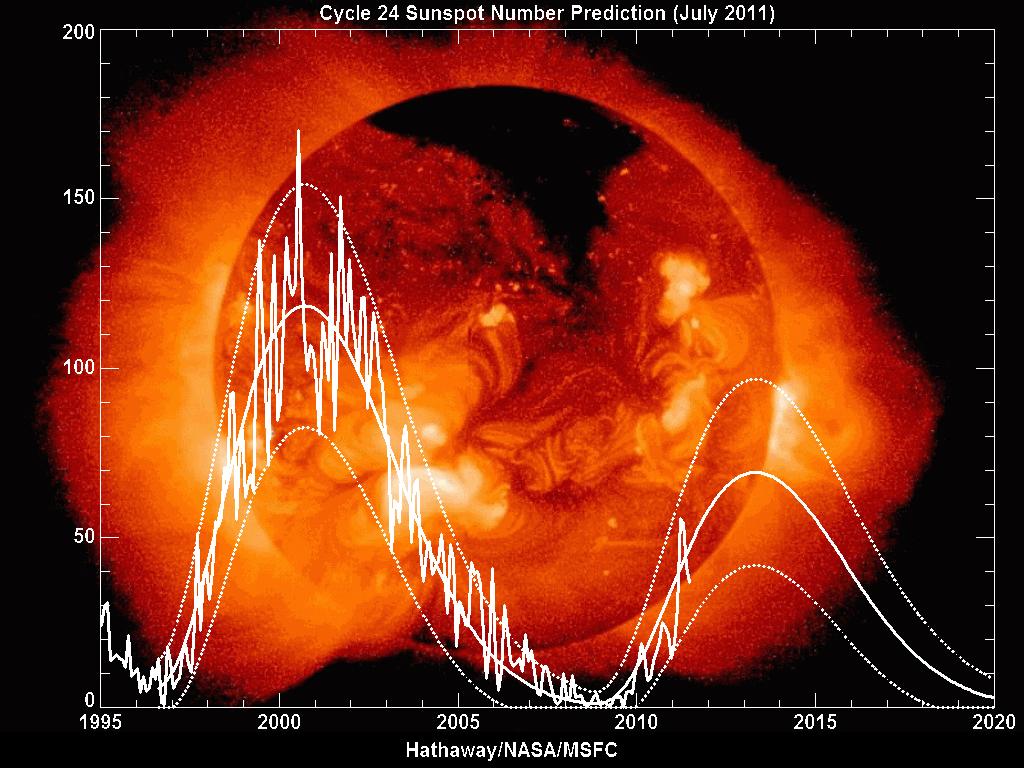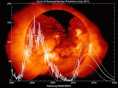 This diagram shows solar activity from 1995 to 2020. The monthly average figures for the relative number of sunspots based on the frequency of sunspot occurrence are depicted. The 11-year activity cycle can be seen clearly here. The next 'maximum level' of solar activity is expected in about 2013, and is predicted to be substantially less powerful than its predecessor.