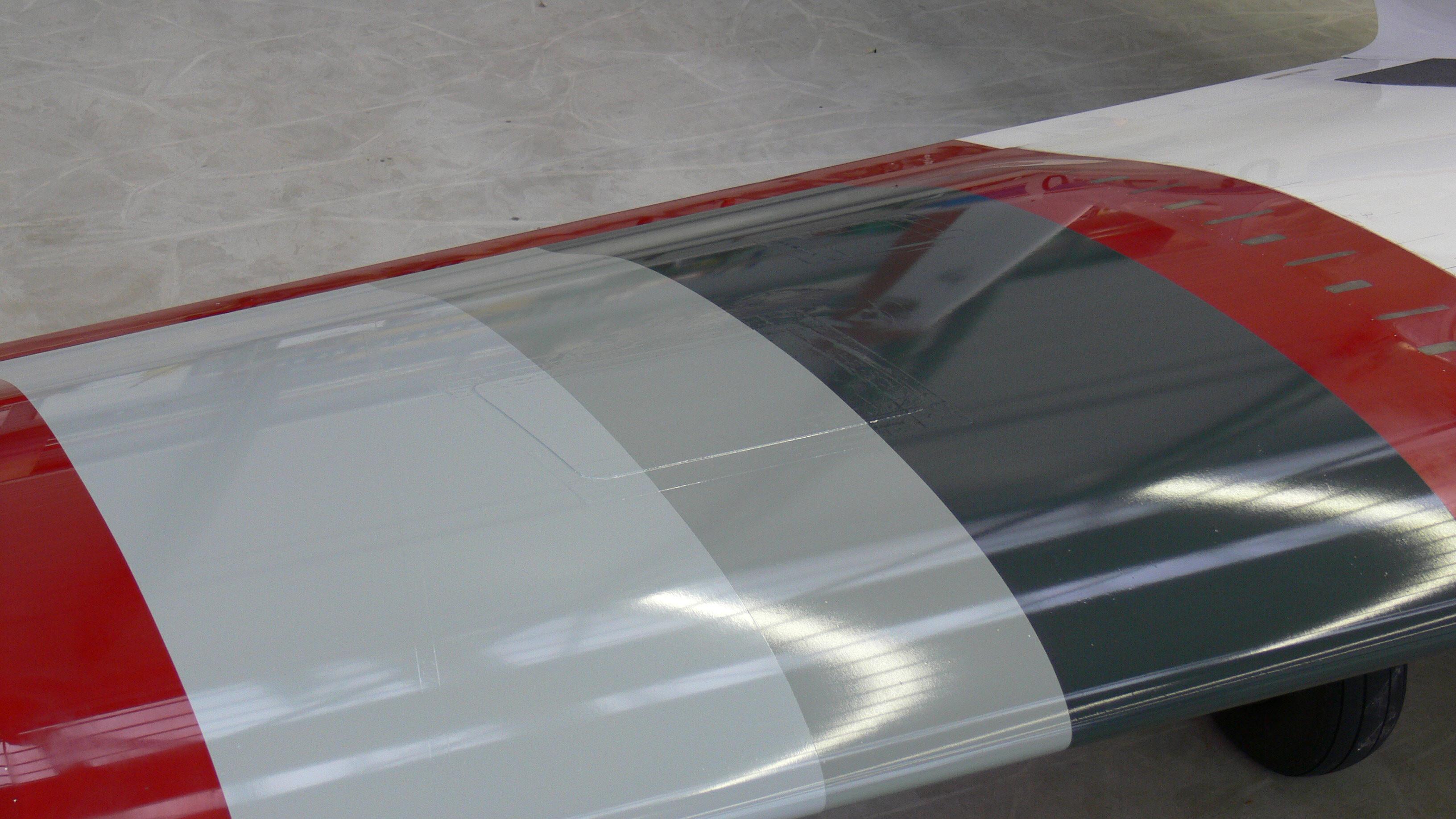 Am rechten Flügel des DLR-Forschungsflugzeugs LFU sind PVC-Folien in verschiedenen Grautönen angebracht. So können die Wissenschaftler die unterschiedliche Absorption der Sonneneinstrahlung und damit einhergehende Temperaturänderungen untersuchen.
