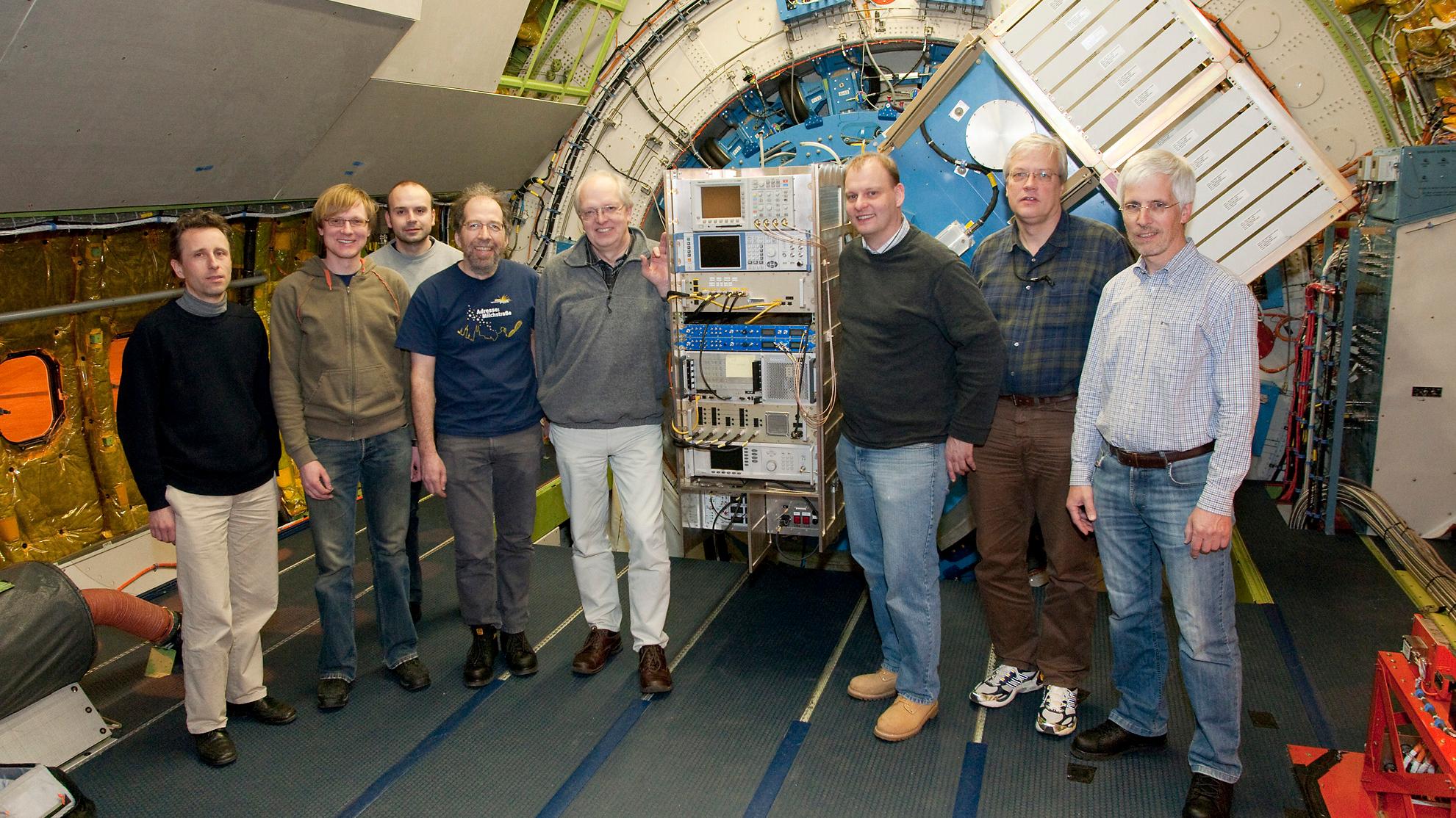 The team is happy as GREAT was installed successfully on the telescope flange. On the left, Helmut Wiesemeyer, Oliver Ricken, Christoph Leinz, Urs Graf, and Rolf Güsten. On the right, Stefan Heyminck, Jürgen Stutzki, and Karl Jacobs.