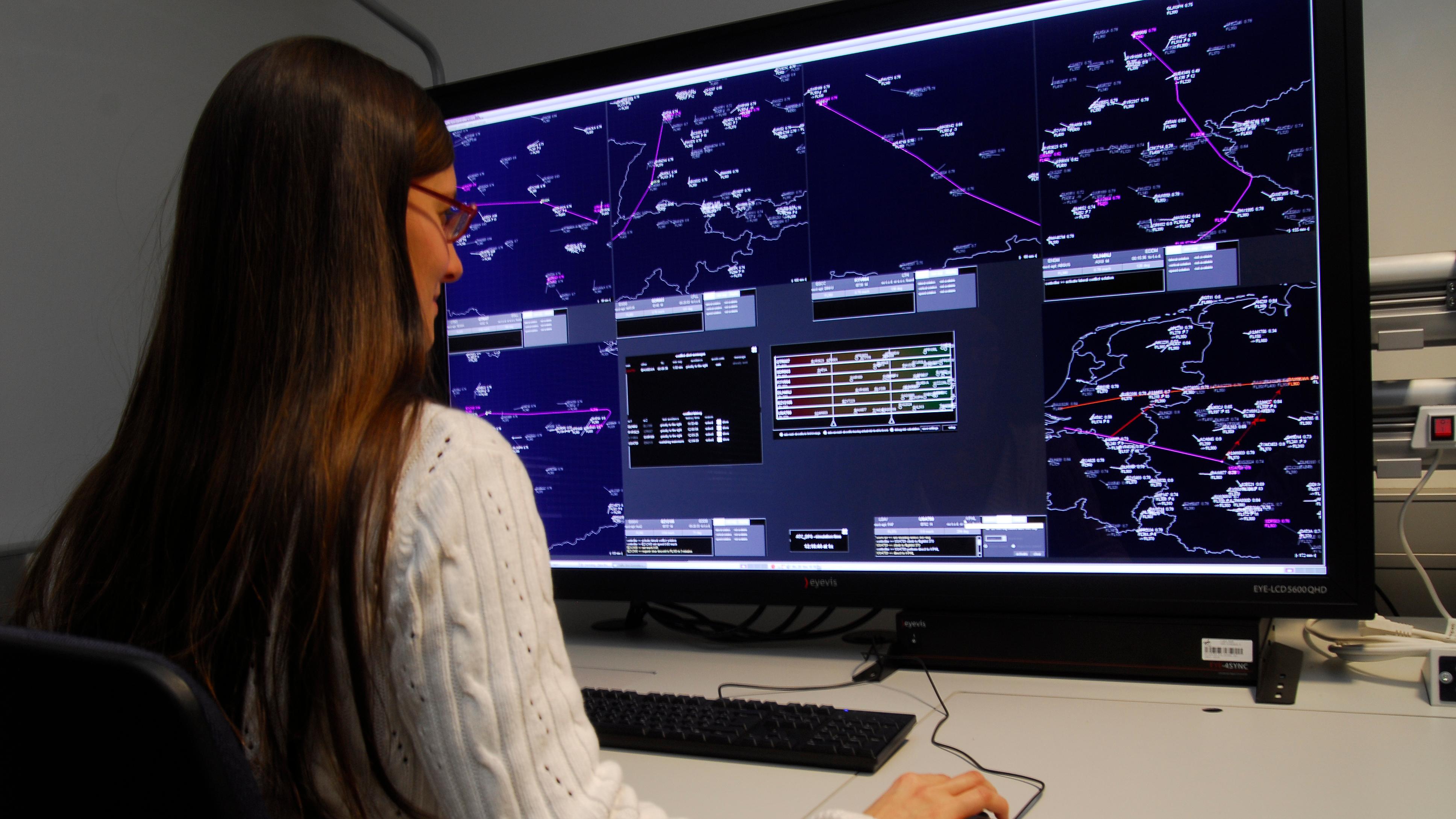 A DLR staff member demonstrates how an air traffic controller can work with the display.