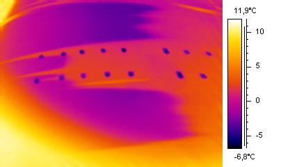 Infrarotbild des rechten Flügels: Die dunklere Farbe deutet auf eine laminare, die helle Farbe auf eine turbulente Strömung hin.