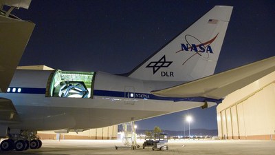SOFIA during test observations of the night sky in March 2008. The opening in the fuselage of the converted Boeing 747SP provides a glimpse of the 2.5-metre infrared telescope, built in Germany.