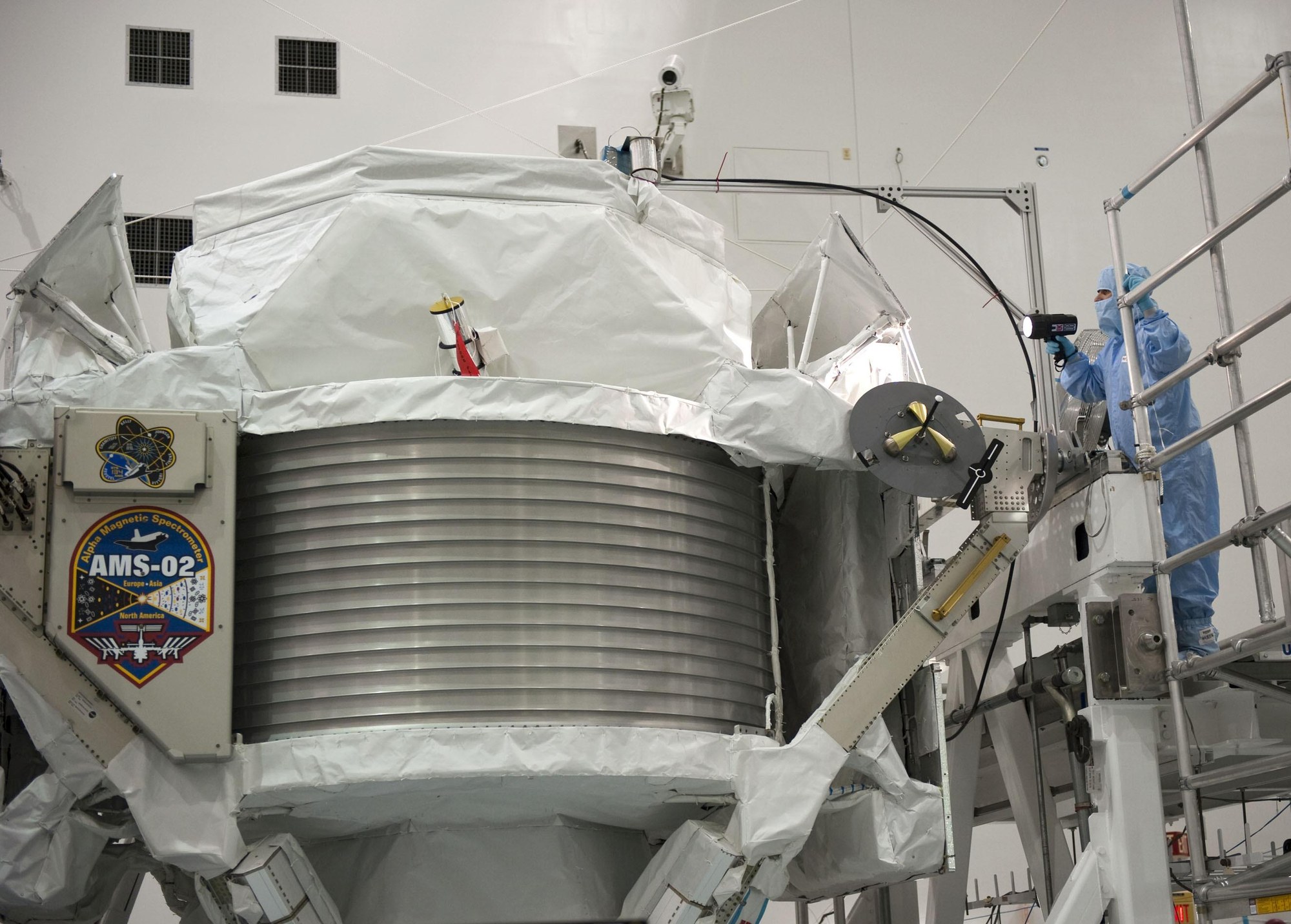 The Alpha Magnetic Spectrometer (AMS) weighs almost seven tons and is four metres high. It uses a powerful magnet to guide charged particles of cosmic radiation through the detectors and then image them like a large camera.