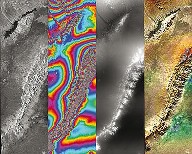 Based on two radar images supplied by SRTM (one of the two images can be seen on the extreme left of this illustration), the first intermediate step is to calculate the differences between them. These differences in phase information are then depicted in the second image from the left as fringes. From these, the elevation model (third image) can be derived. Low-lying regions are shown as dark areas, with lighter coloured areas denoting higher elevations. Each grey-scale value represents an elevation measured in metres above sea level. The last image in the sequence shows the final digital elevation model, shaded and coloured using an atlas colour scheme. To make the image easier to interpret, the radar image is incorporated into the colour data.