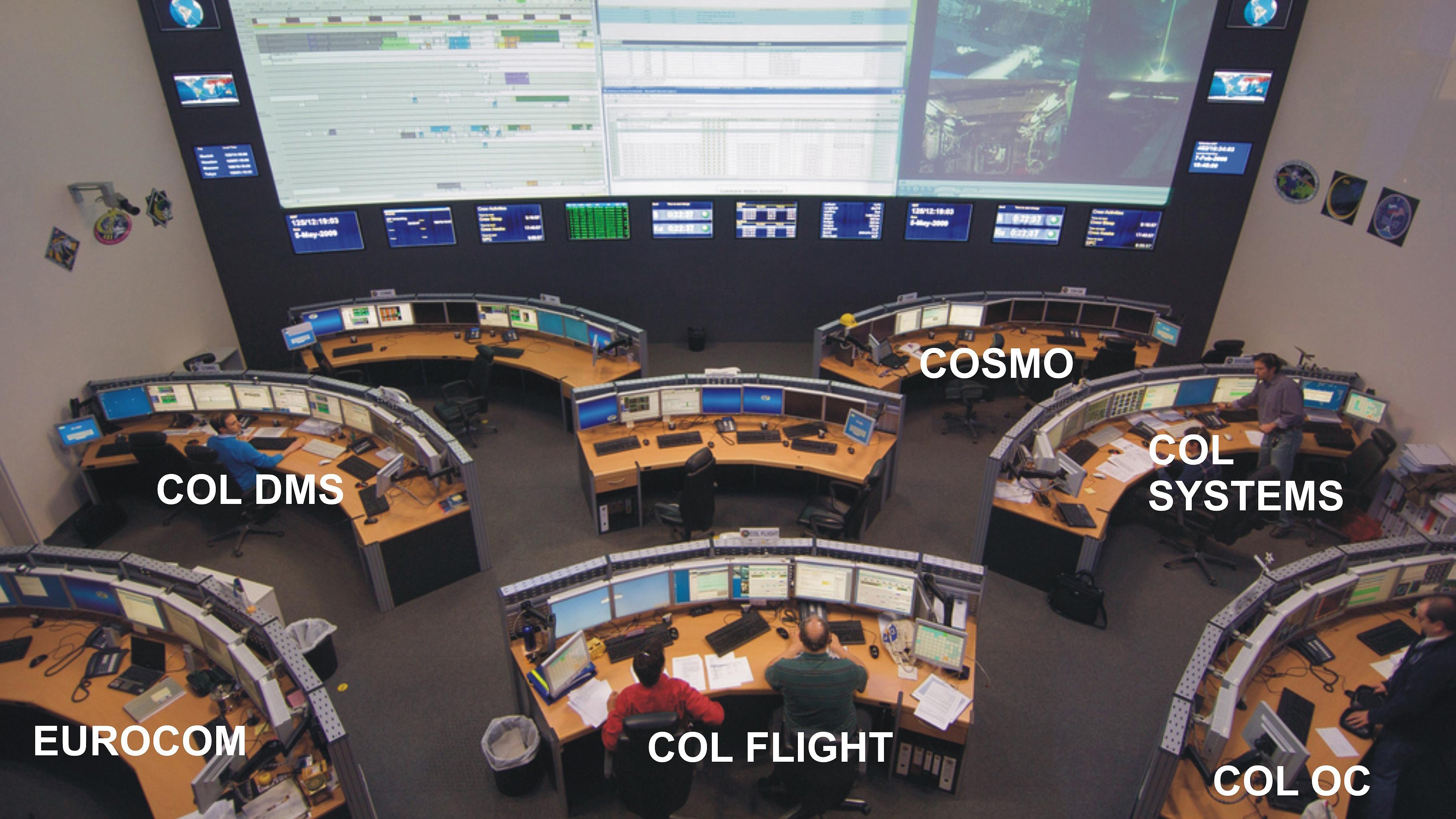A view of the Oberpfaffenhofen ISS control room showing the different console positions needed to monitor Columbus.