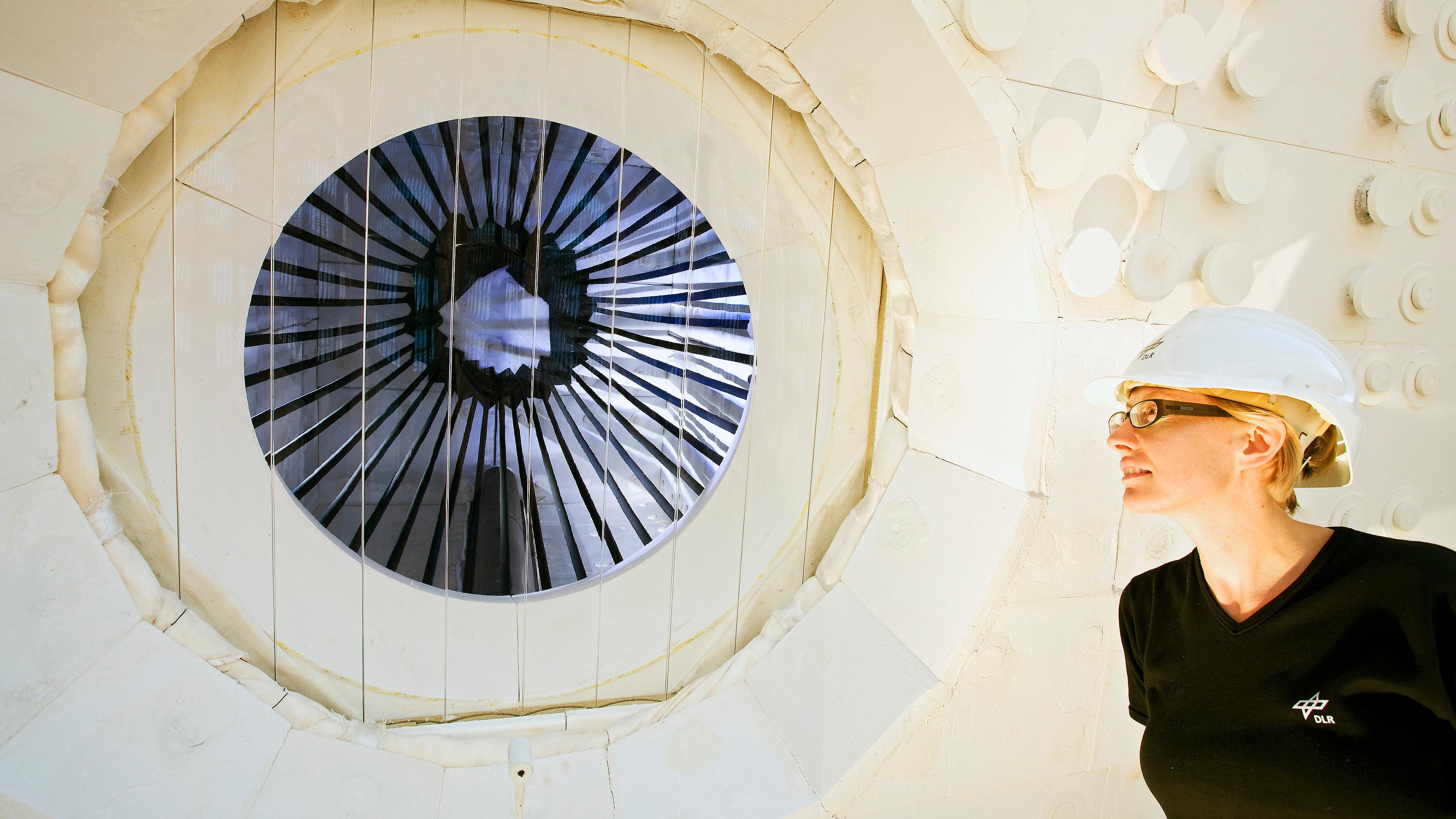 Last visual check: DLR employee Miriam Ebert checks to ensure that the ceramic fibres protecting the radiation receiver are well sealed. The test power station Solhyco has been constructed in a 60-metre-high solar tower at the Plataforma Solar de Almería, owned by the Spanish research centre CIEMAT, in southern Spain. The sunlight that the mirrors direct on to the radiation receiver in the tower heat the absorber tubes to 800 degrees Celsius. The radially arranged black tubes conduct this heat to a 100-kilowatt micro gas turbine, which drives a generator that in turn produces electricity.