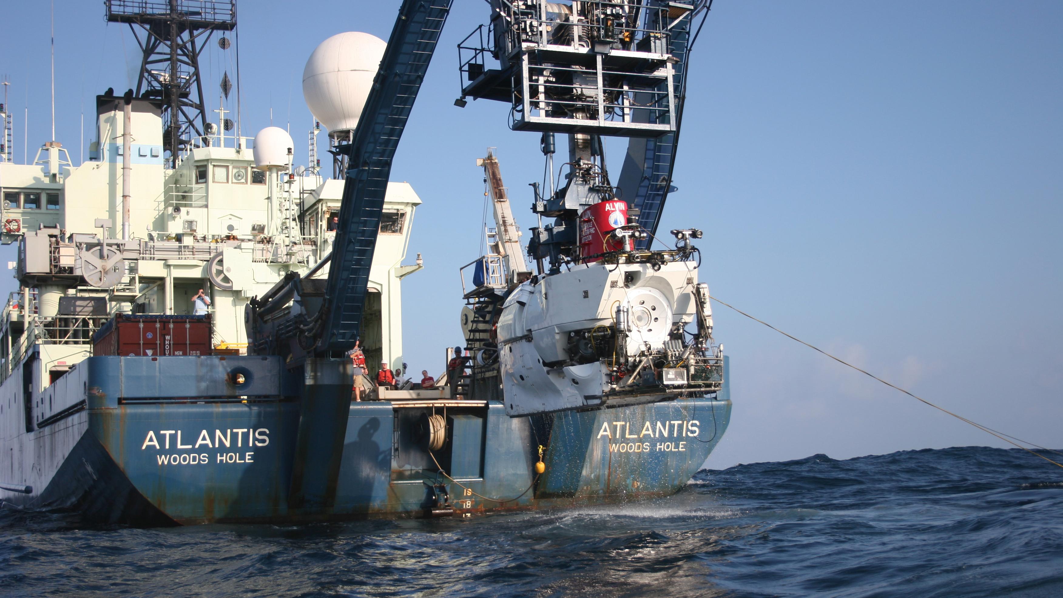 The crane on the stern of the ATLANTIS lifts ALVIN off the deck and lowers it into the water. The submarine – now no longer connected to the research vessel – then slowly dives towards the bottom of the ocean, at a speed of about two kilometres per hour.